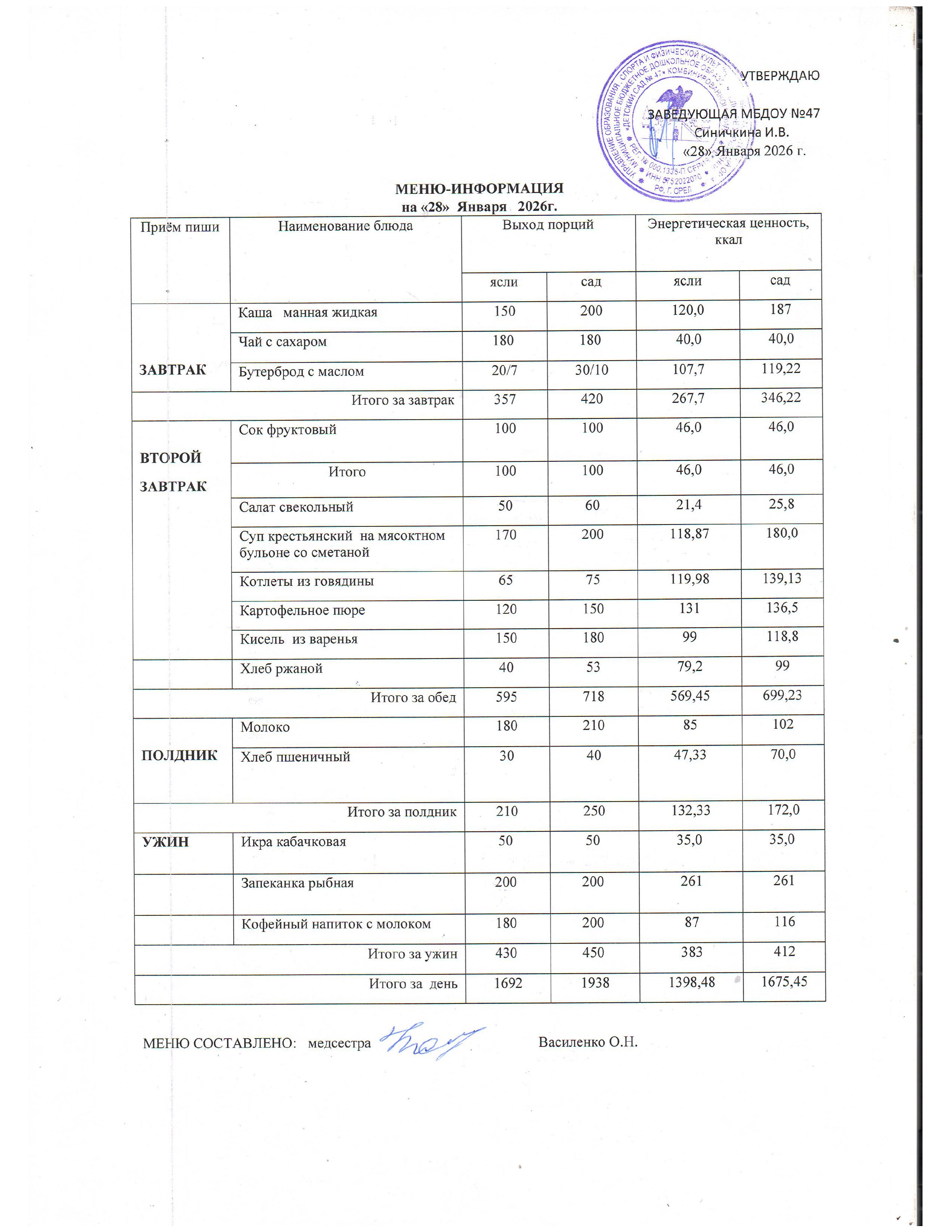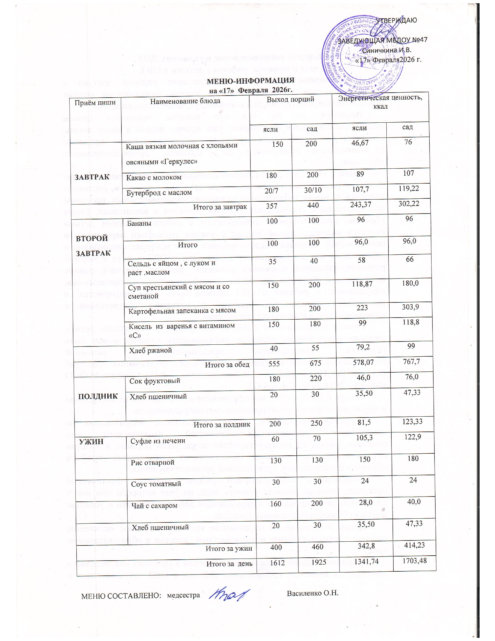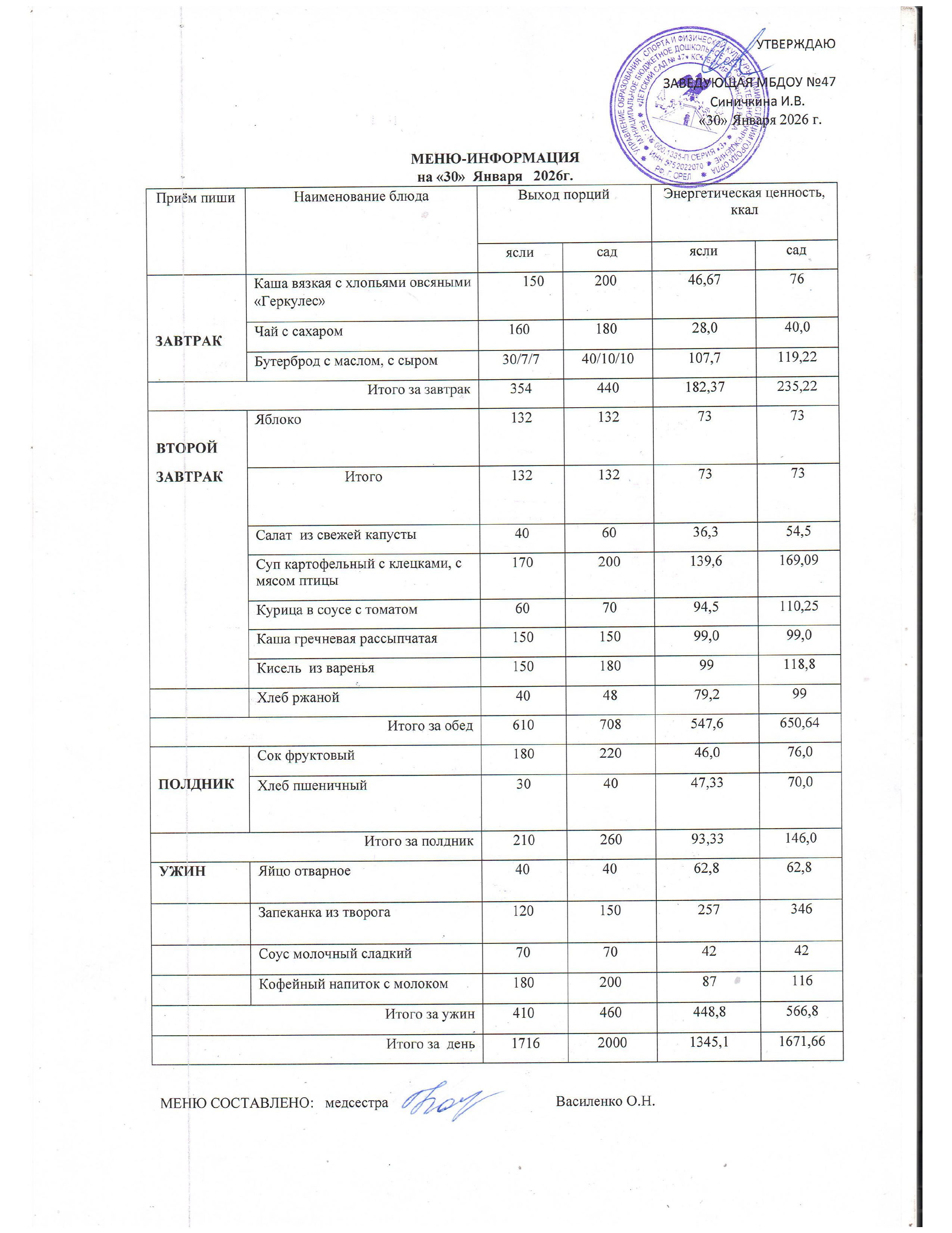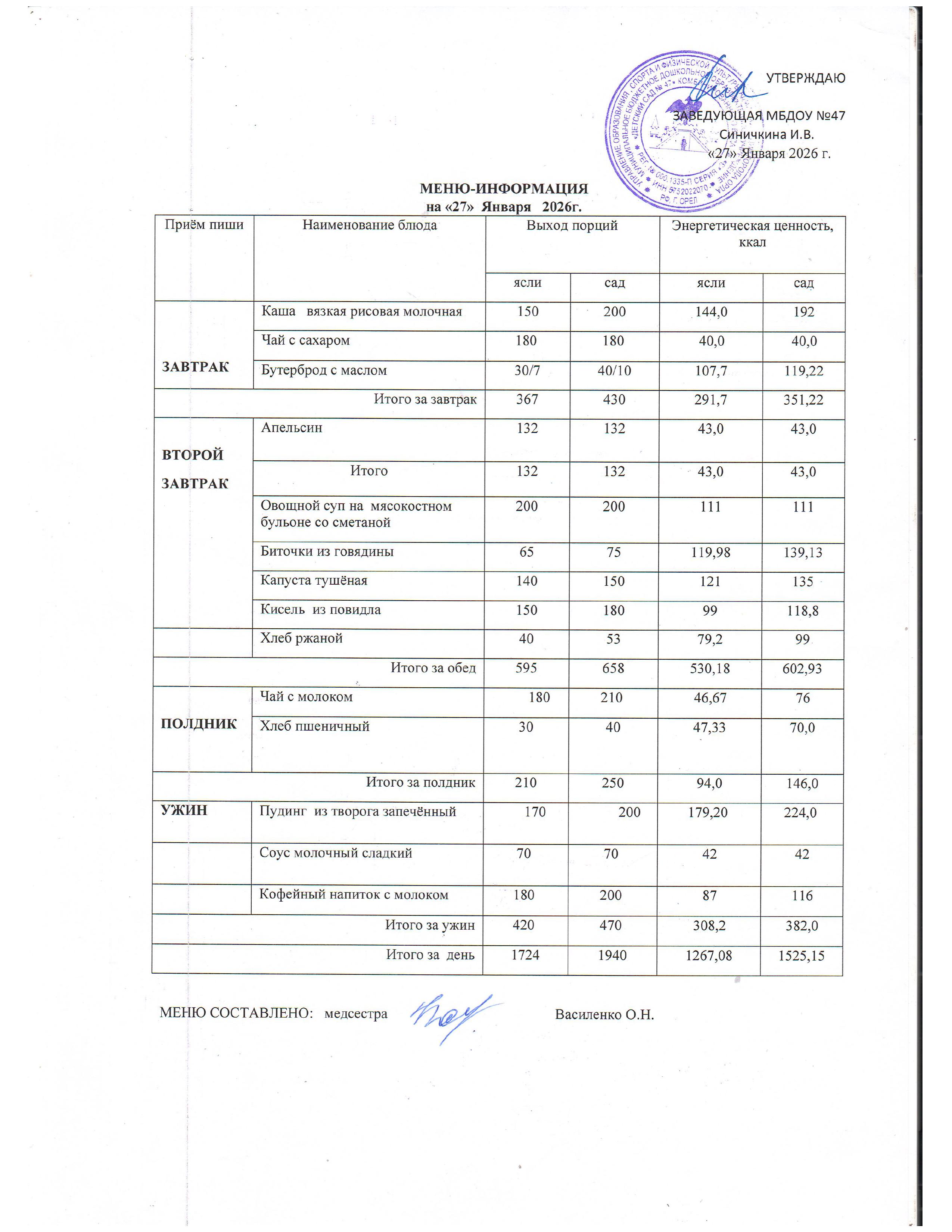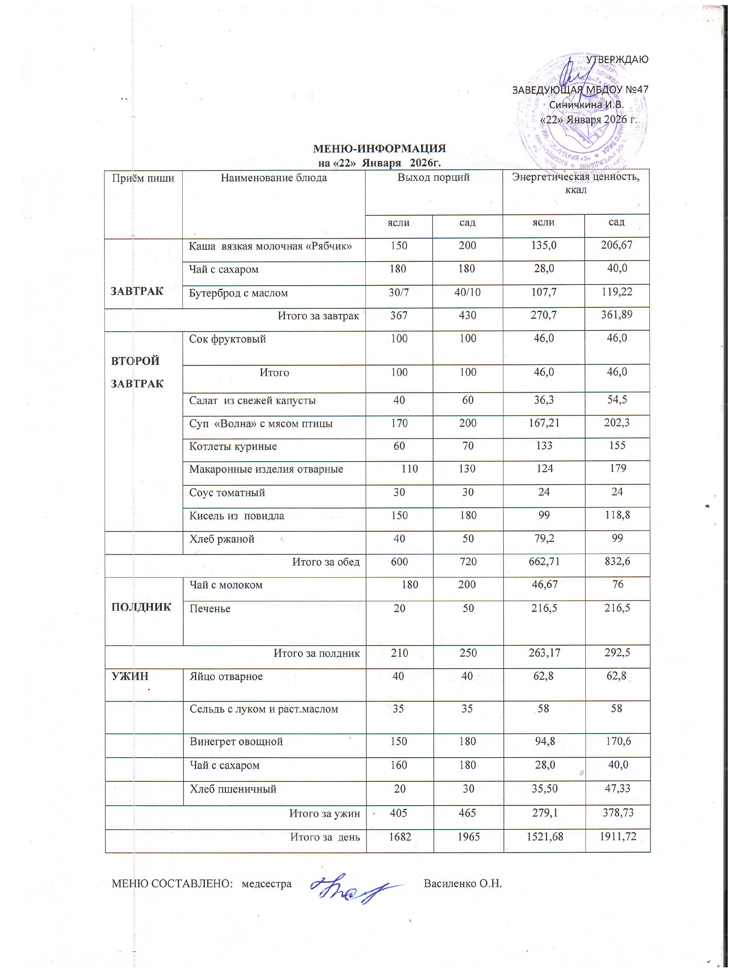 Приложение № 7. Таблица 1. Среднесуточные наборы пищевой продукции для детей до 7-ми лет.