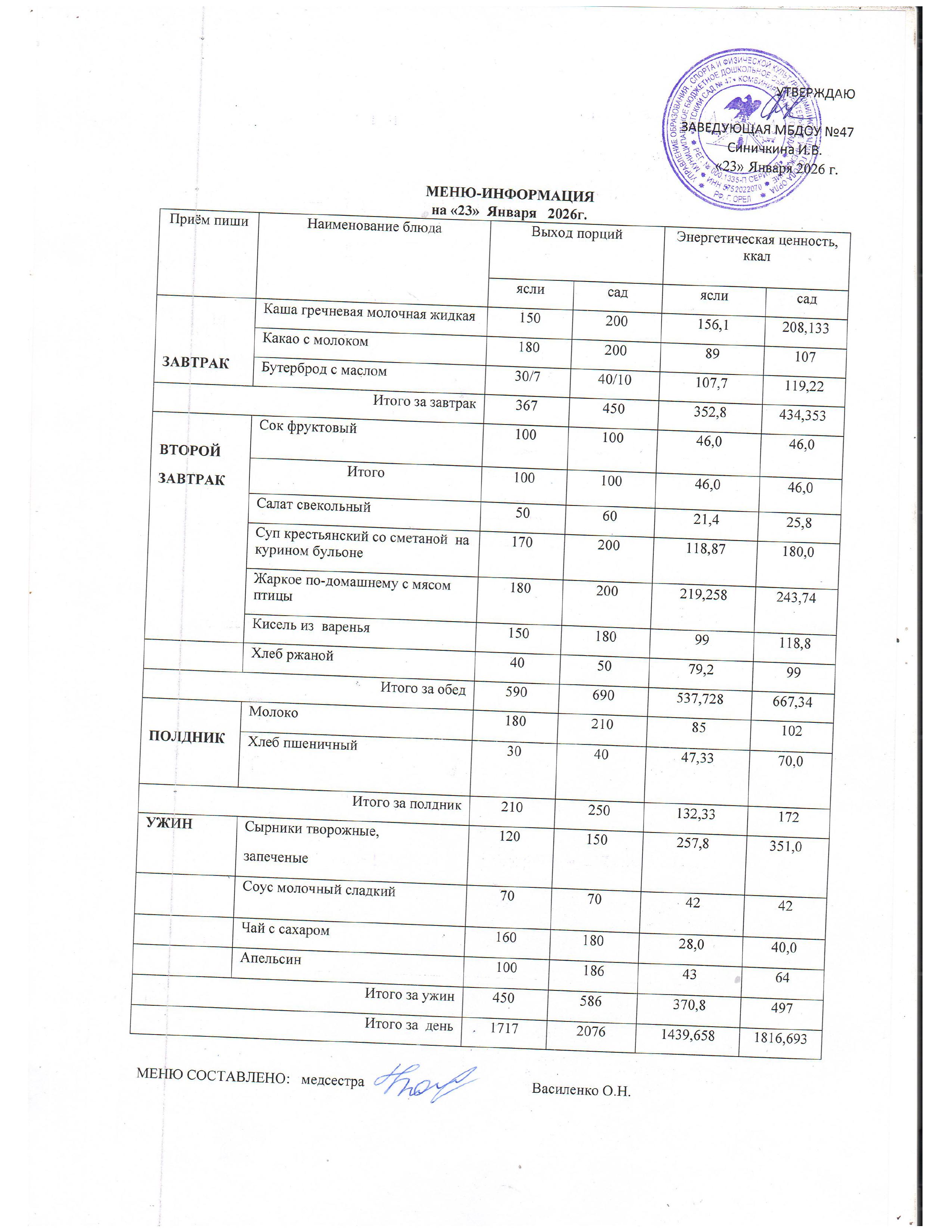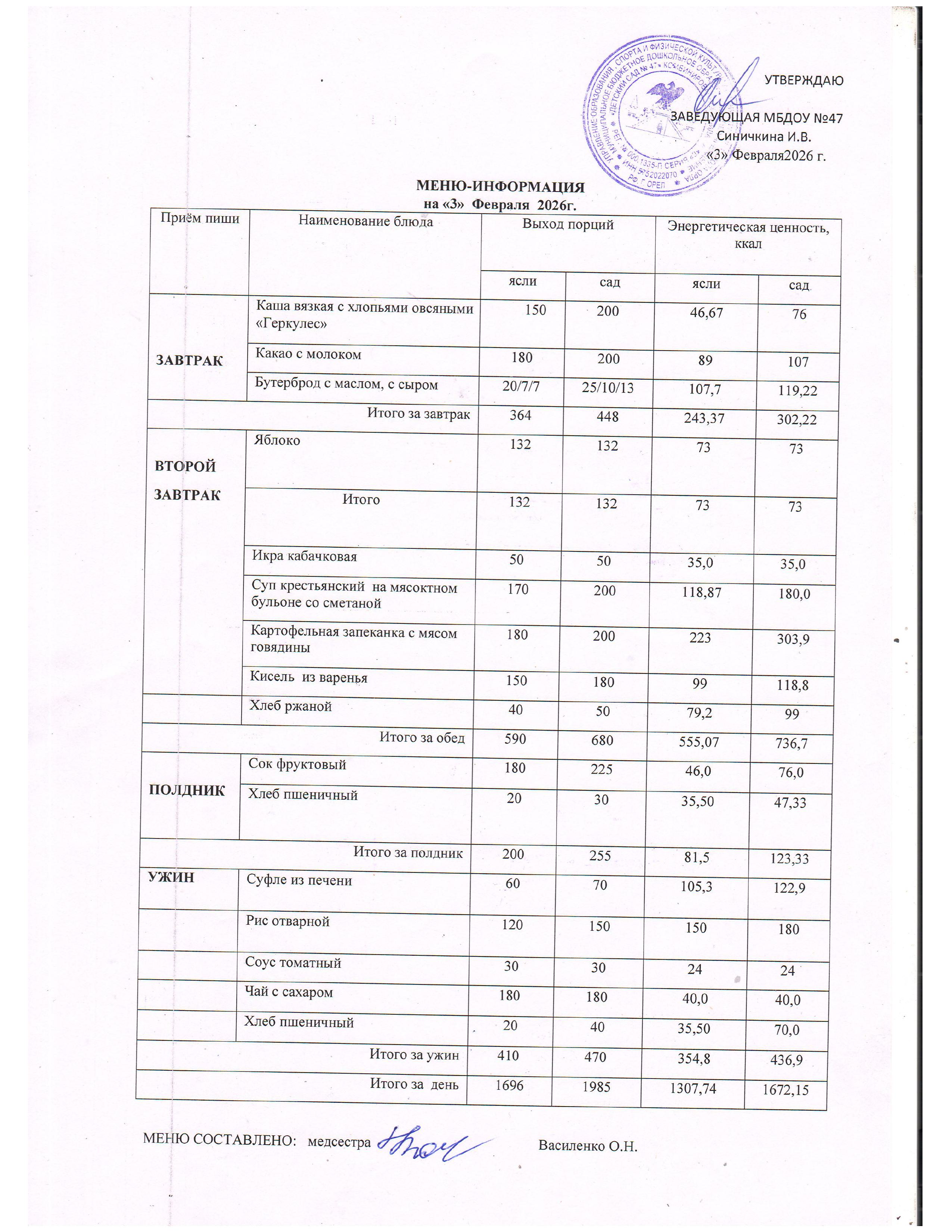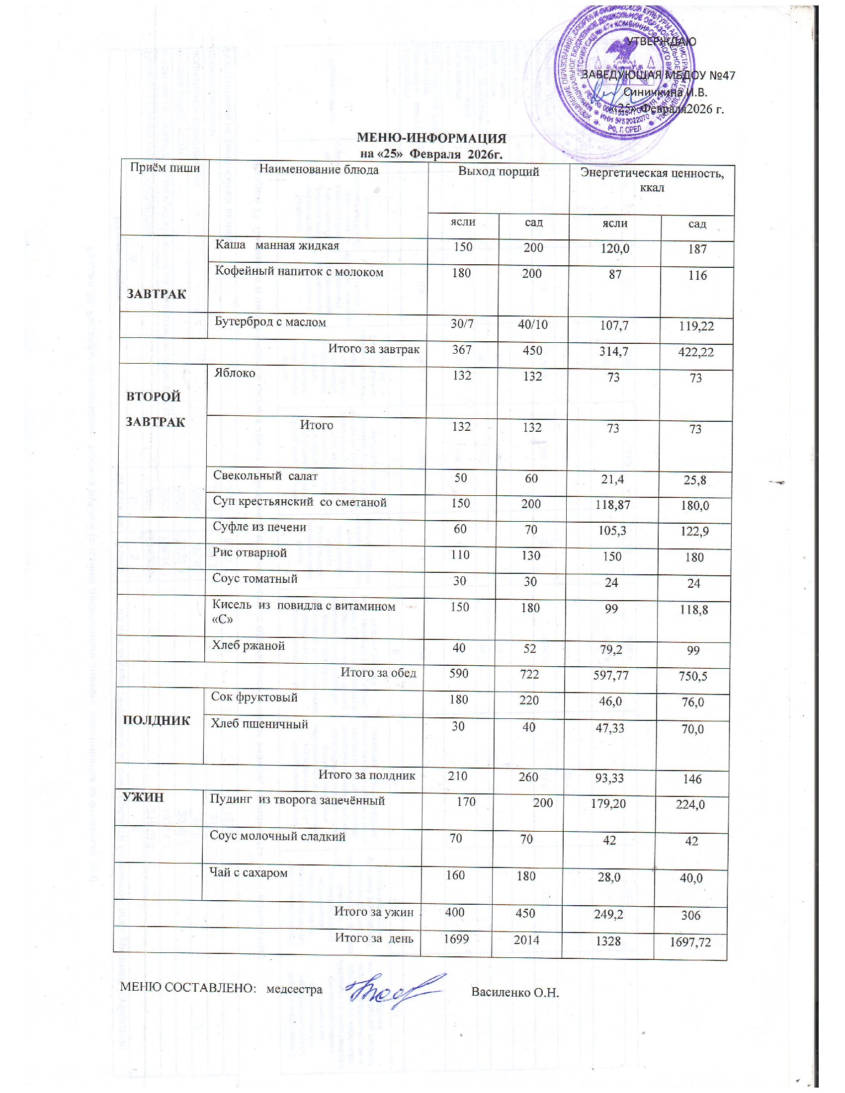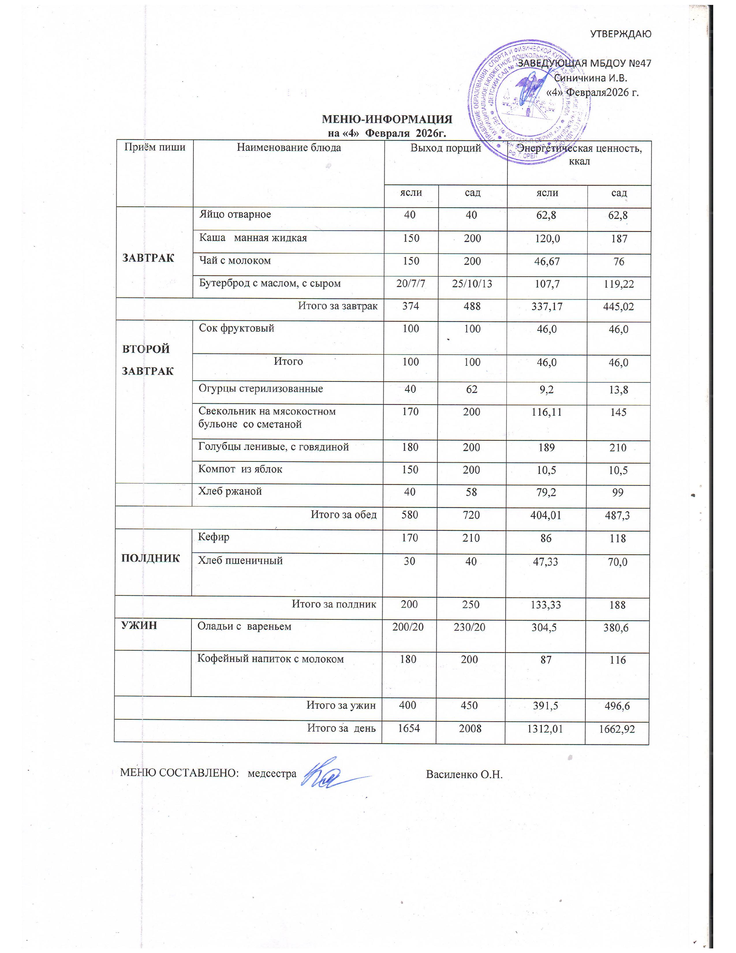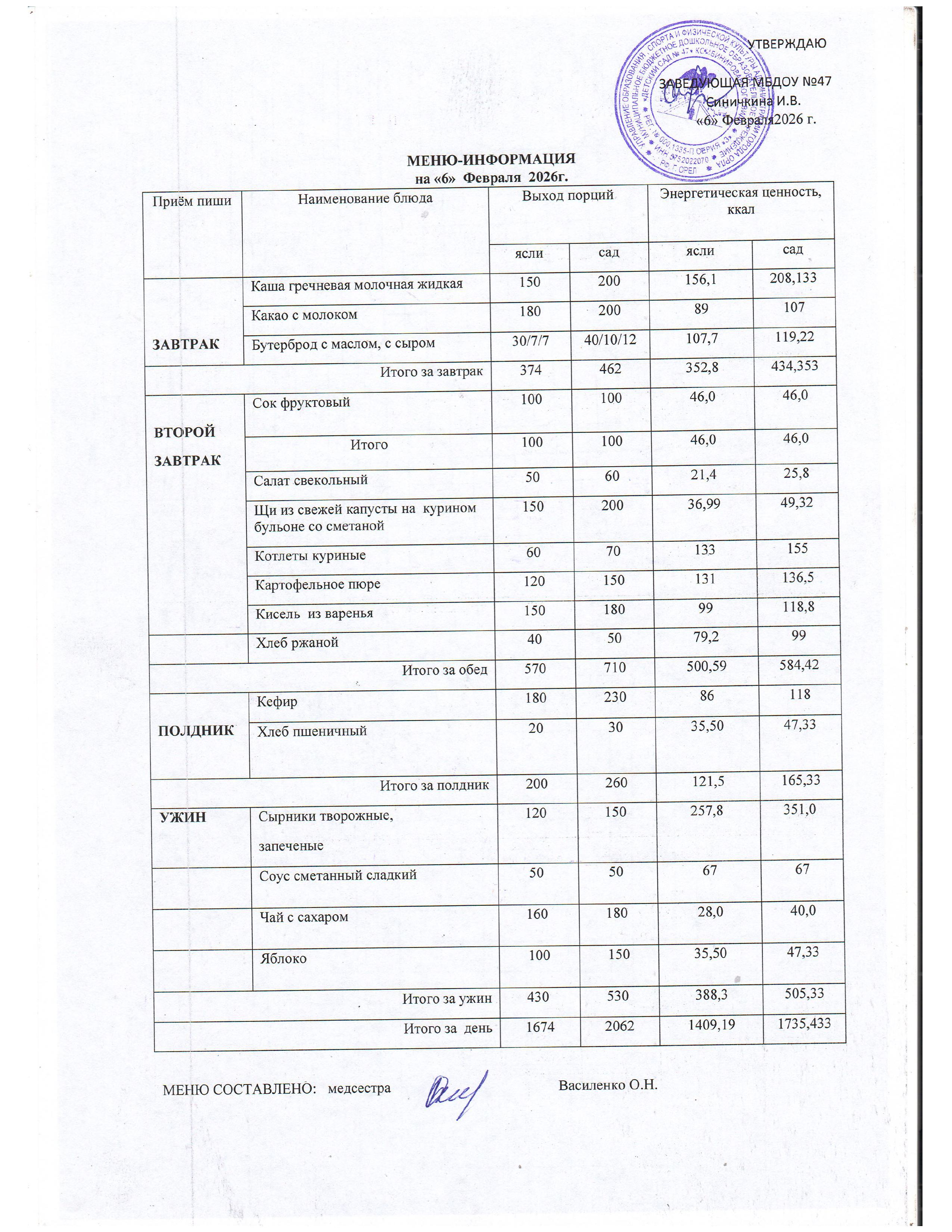 Меню горячего питания