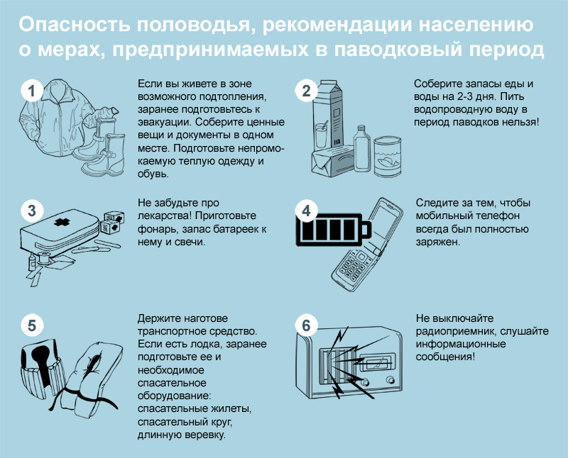Принять предупредительные меры - создать уплотнения в притворах дверей и окнах подвальных, цокольных и первых этажей; очистить от мусора водосбросные канавы в районе Вашего дома; закрыть вентиляционные отверстия в подвальных помещениях с целью предупреждения поступления наружных поверхностных вод; освободить подвалы от имущества и продовольствия; предусмотреть вывод животных и птиц из подтапливаемых помещений в безопасное место; заготовить мостки, доски и опоры к ним для обустройства проходов к дому и надворным постройкам на подтапливаемых участках; заранее составить перечень документов, личных вещей и имущества, необходимых в случае эвакуации; уложить в рюкзак необходимые теплые вещи, двухсуточный запас продуктов питания и воды; о возникновении подтоплений, и выявленных причинах, сообщайте по телефону 101, с мобильного 112.