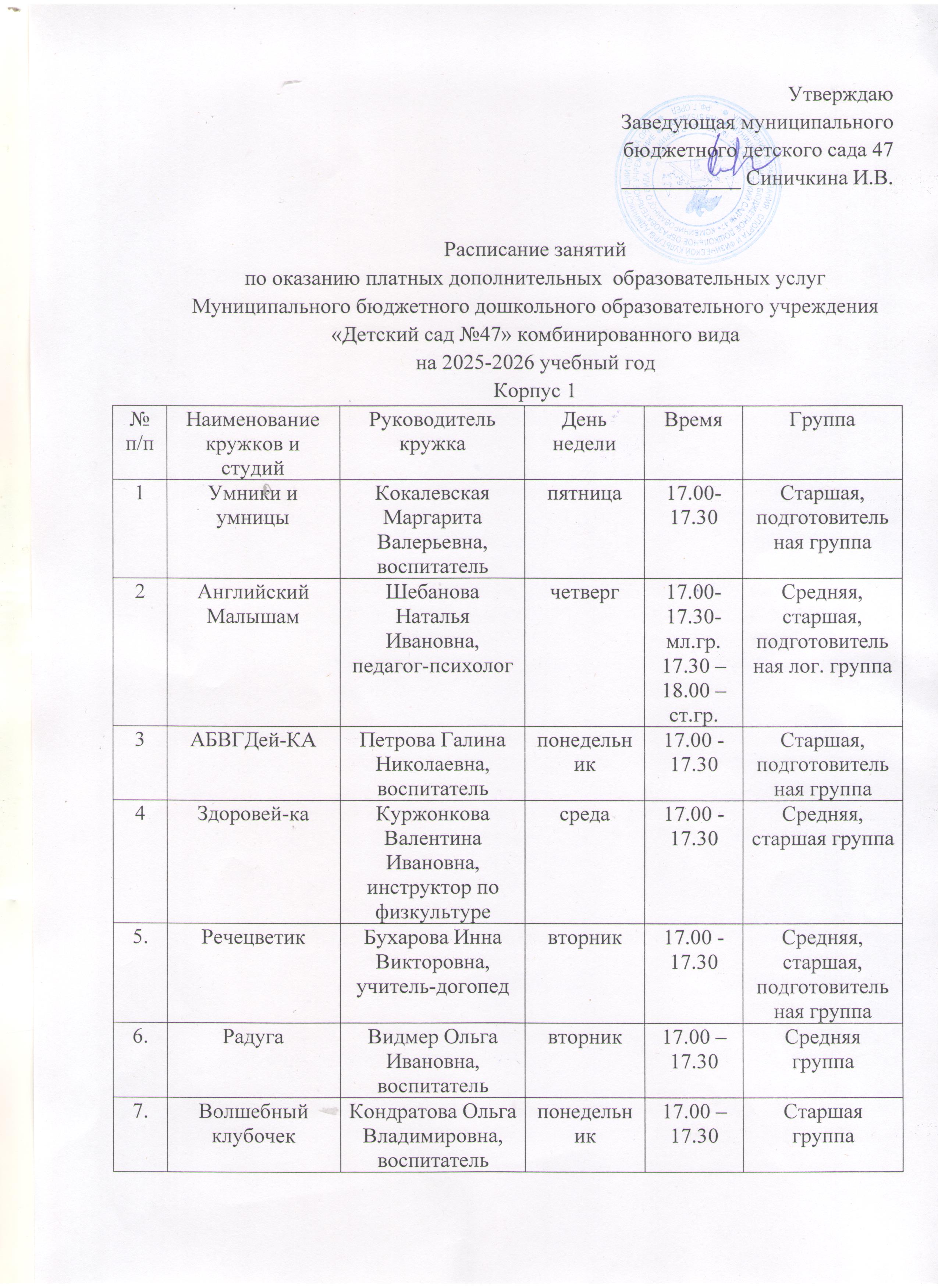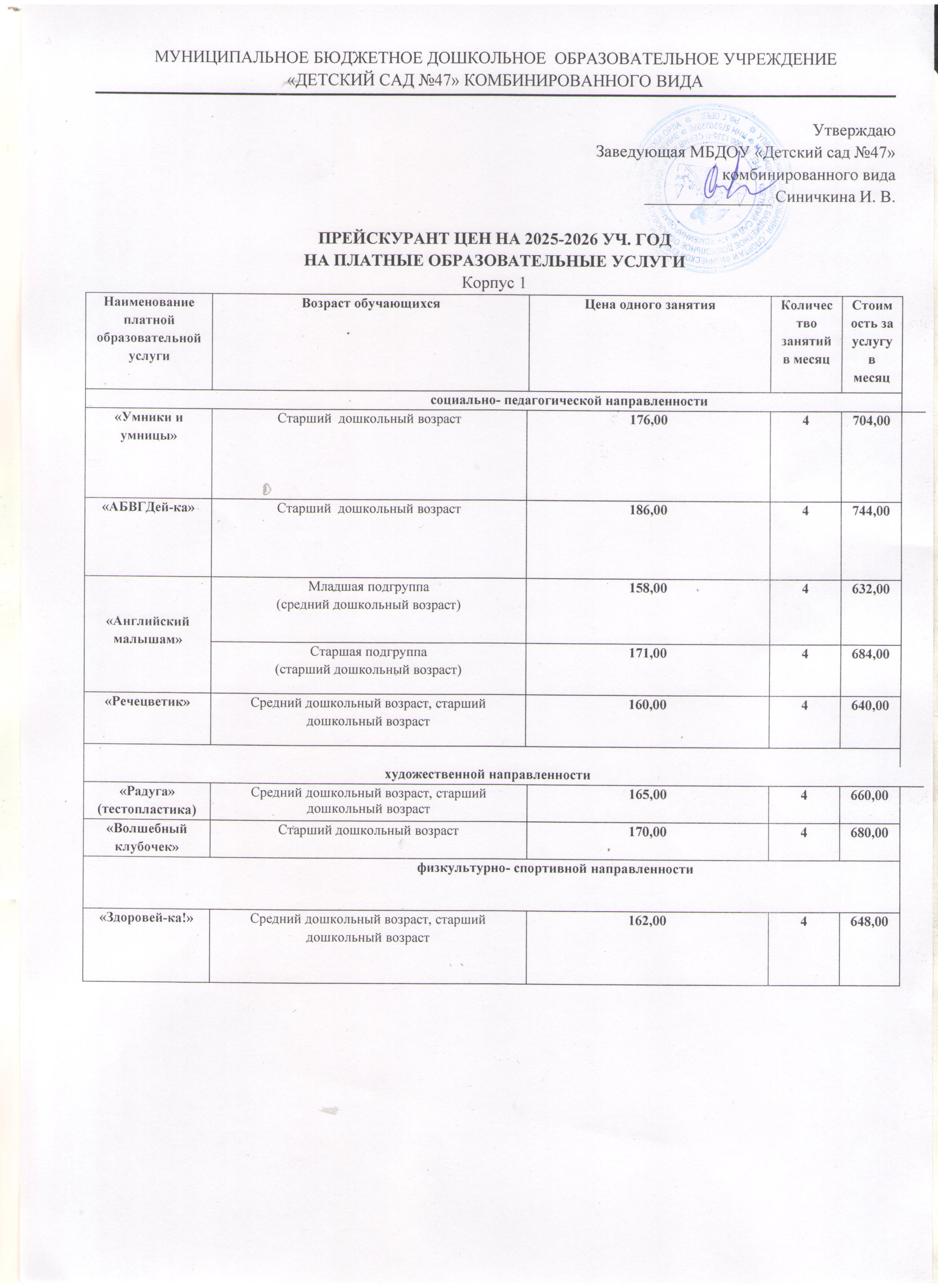 Прейскурант цен на платные образовательные услуги в МБДОУ корпус 1