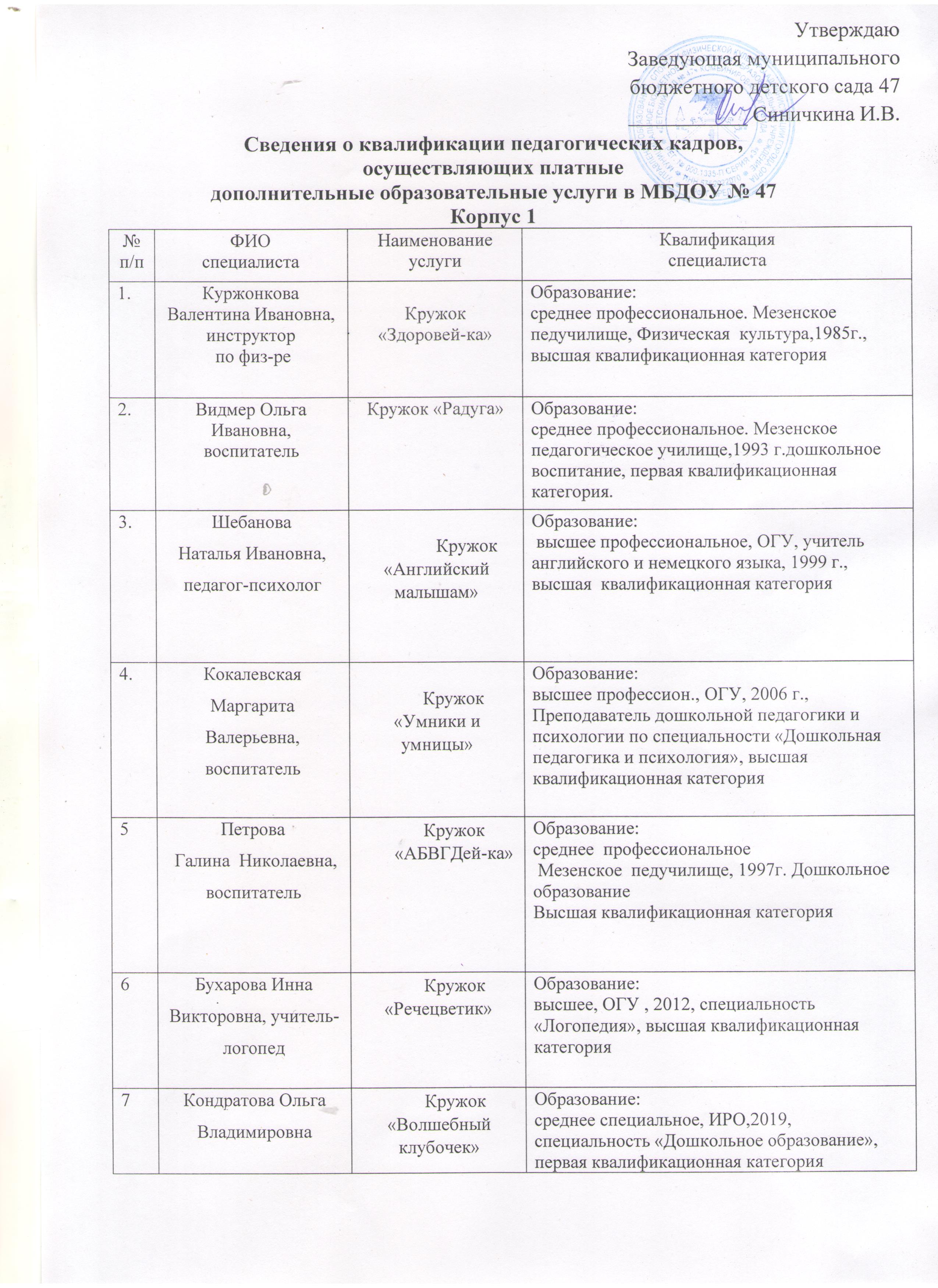 Уровень квалификации педагогв в кружках дополнительного образования корпус 1